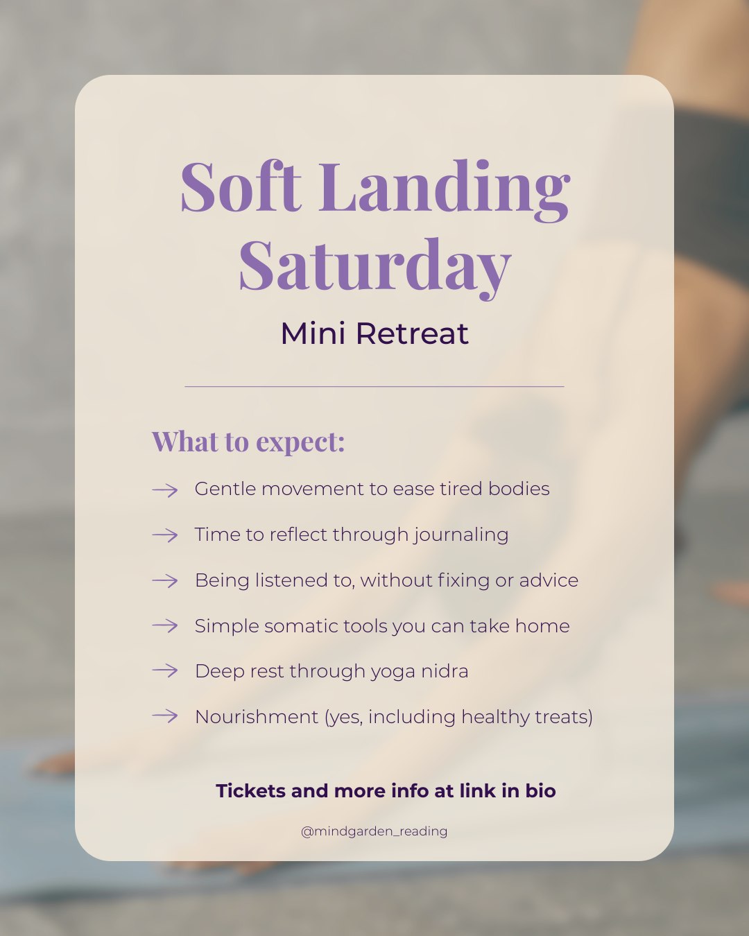 Soft Landing Saturday isn’t about doing more, it’s about being supported. This mini retreat is about having some restful time to move your body, soothe your nervous system and have some spaciousness.